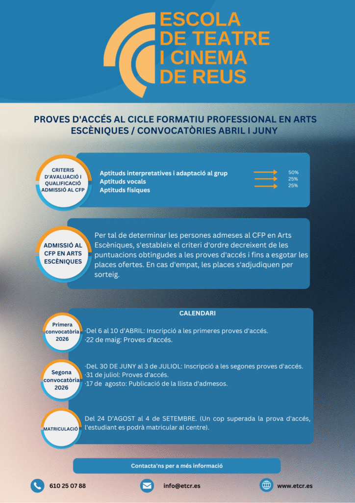 La inscripción a las segundas pruebas quedarán abiertas del 30 de junio al 3 de julio del 2026 y se realizarán en la Escuela de Teatre i Cinema de Reus o a través del siguiente formulario: